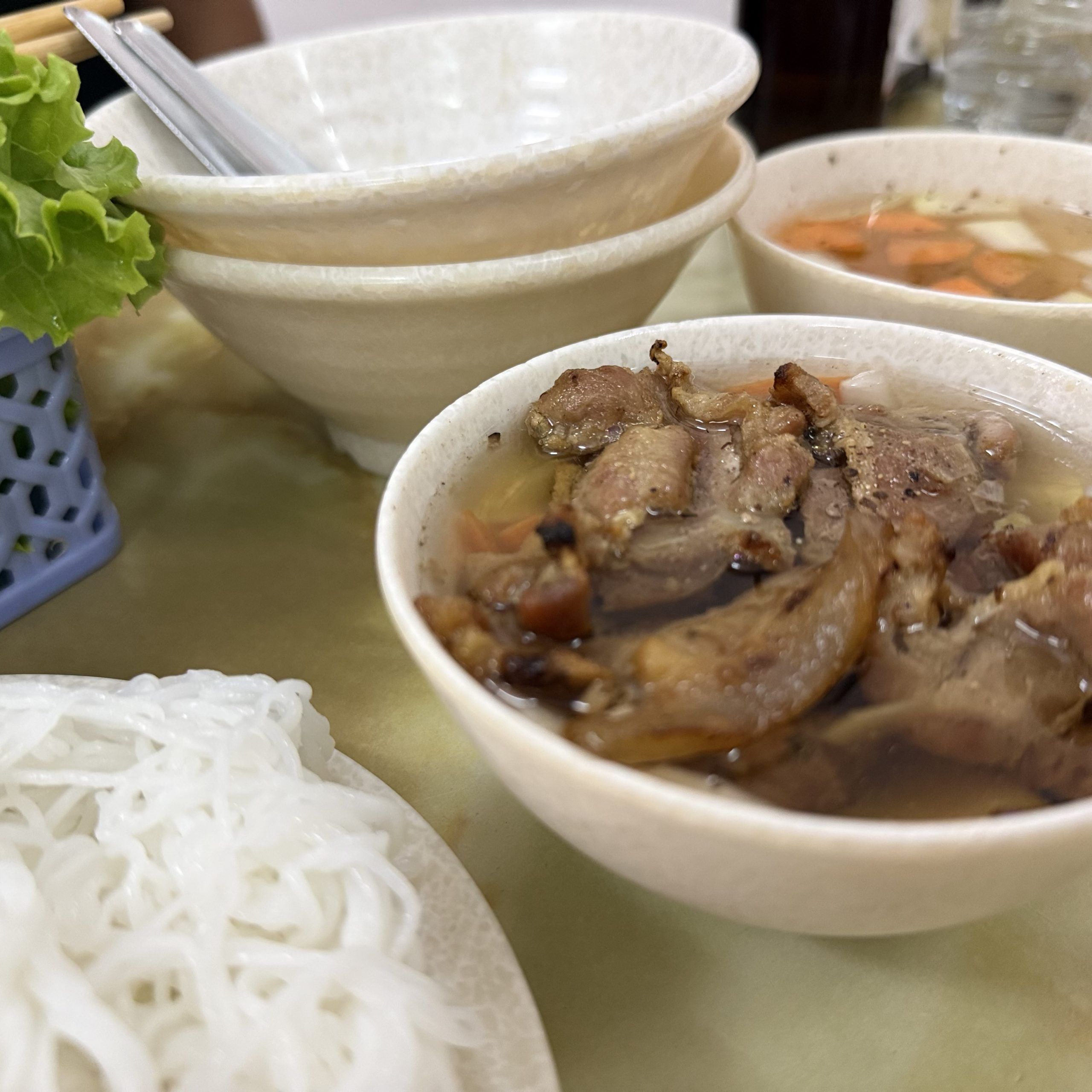 細めの米の麺を付け汁に浸して食うのだけれど、ミント、パクチー、レタスなどの香草類とか、大根・人参の甘酢漬け、もやしなんかが、雑多に大量に運ばれてきて、麺と一緒にザクザクと喰うスタイル。