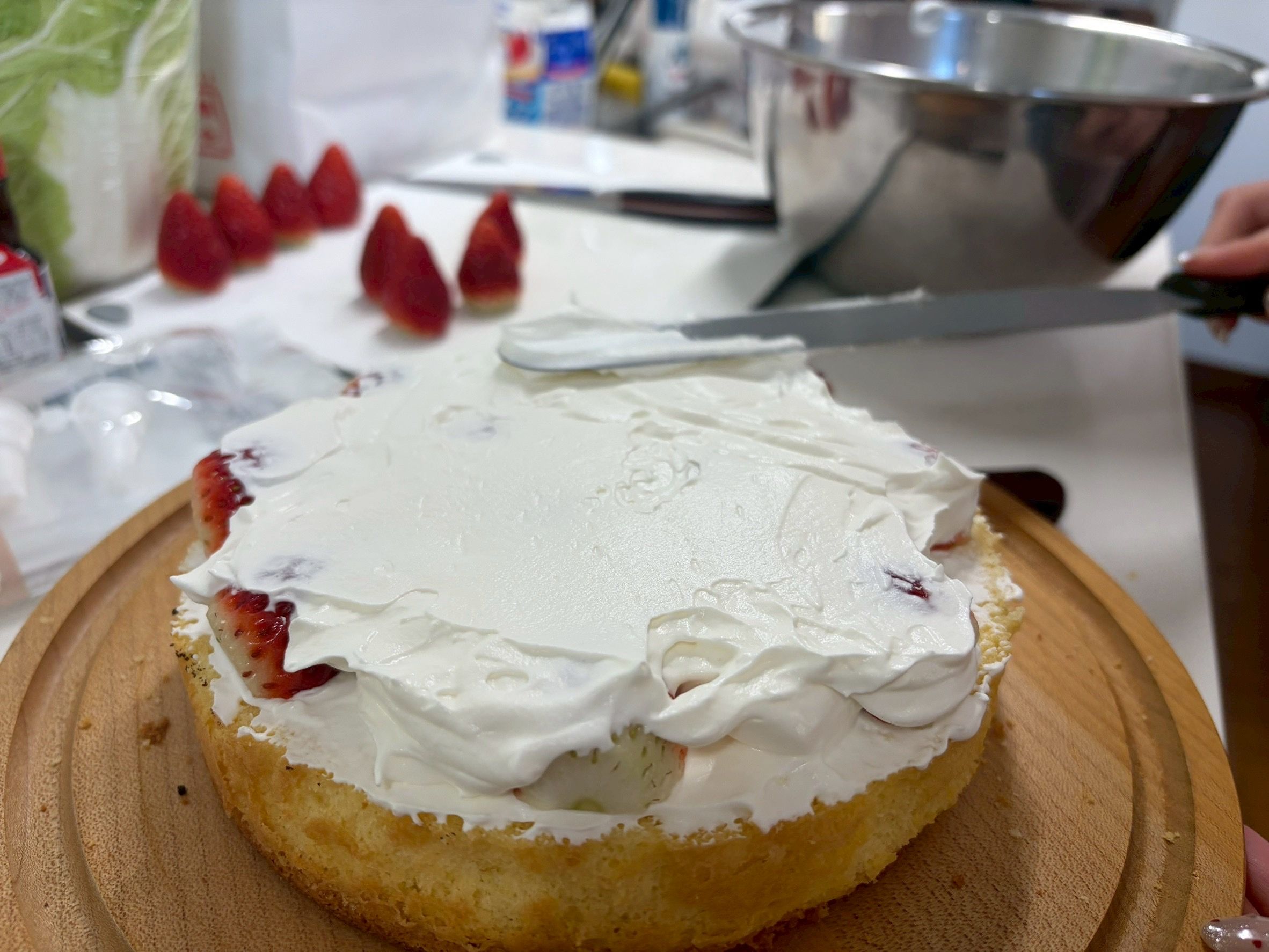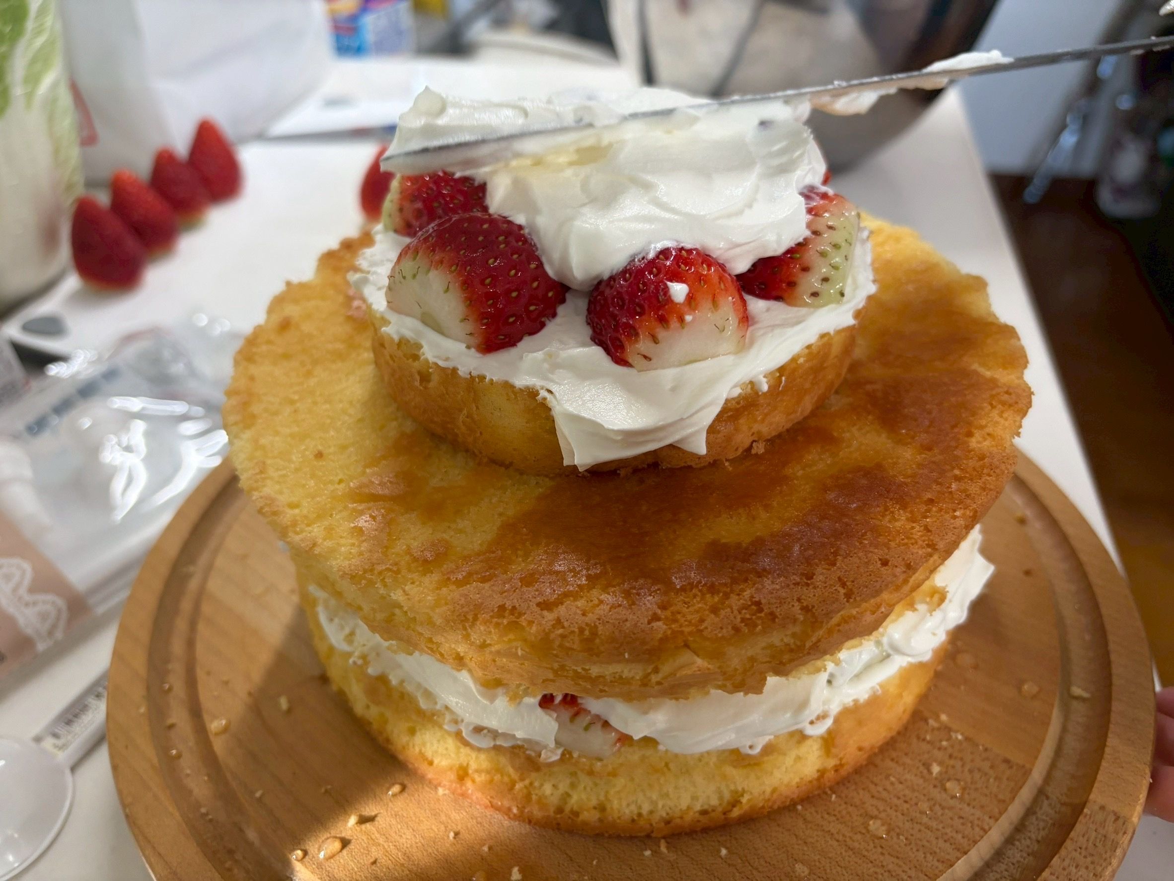 とはいえ、前にも二段重ねは作ってるんで工程は見えているものの、やることがいっぱいあって気が重い。。。クッキー焼いて、スポンジ二回焼いて、いちご大量に切って生クリーム塗って。。。。と。